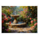 This painting depicts a vibrant garden filled with blooming roses in various shades of pink and red, surrounding a charming stone fountain. The water cascades gently from the top, creating a soothing atmosphere amidst the lush greenery. A sunlit stone pathway winds through the garden, inviting visitors to explore the peaceful oasis. The interplay of light and shadow enhances the warm, golden tones of the scene, highlighting the delicate petals and textured stonework. This picturesque garden exudes elegance, tranquillity, and timeless beauty.