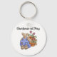 A teddy bear in blue bib overalls tends to his flowers in clay pots and text reads "Gardener at Play" on gardener T-shirts, mugs, tote bags, mousepads, stickers, buttons, and other items.