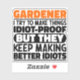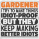 Funny Gardener Sayings "Gardener I Try To Make Things Idiot Proof But They Keep Making Better Idiots". Grab this Funny Gardener design as a funny gifts for an awesome mum, dad or friend.
