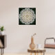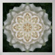 Created from original photos of the shapes and patterns of a summer Gardenia blossom, a mandala in ivory, white, gold,and pale green over a dark green leafy abstract background.