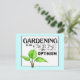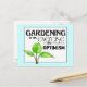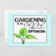 The design has a computerised drawing of a seedling in the corner, and writing in various fonts which reads 'Gardening is an exercise in optimism'.