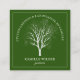 An artistic square gardener business card featuring a white tree silhouette with curved typography on a green background.