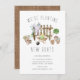 New roots moving announcement card featuring a gardening scene including a wheel barrow, shovel & potted plants with a wooden fence backdrop. Flip our new address card over to view a coordinating rustic burlap back for an extra special touch.
