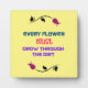 Typography design with a gardening themed inspirational motivational quote which says " every flower must grow through the dirt. Set on a pale yellow background. A red rose flower illustration frames the top and bottom of the text. Interesting quote especially for gardners.