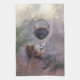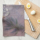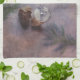 A kitchen or tea towel with a digital painting of a glass of red wine with some cloves of garlic, and a suggestion of rosemary and sage, on a background of mottled pastel colours in shades of purple violet, beige or tan and grey.