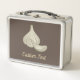 Garlic bulb with clove icons with woodcut shading. Custom background colour. Custom text on both sides.