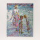 A mother, sunhat gently tilted, guides two children through a shimmering tidepool of color and light. They bend in curiosity, searching for sea-treasures beneath the ripples — shells, stones, maybe memories. The scene captures the innocence of childhood and the quiet strength of maternal presence. Waves glisten in hues of turquoise and lavender, while soft shadows dance in sun-washed sand. There's movement, but also stillness — like a moment suspended in warm salt air.