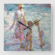 A mother, sunhat gently tilted, guides two children through a shimmering tidepool of color and light. They bend in curiosity, searching for sea-treasures beneath the ripples — shells, stones, maybe memories. The scene captures the innocence of childhood and the quiet strength of maternal presence. Waves glisten in hues of turquoise and lavender, while soft shadows dance in sun-washed sand. There's movement, but also stillness — like a moment suspended in warm salt air.