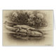An interesting black and white vintage rendering of a small American alligator rest atop a larger sleeping American alligator.