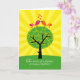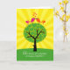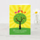 Two birds, sitting on a tree, K-I-S-S-I-N-G! Colourful stylised birds on top of a tree with heart leaves and yellow sun rays radiating out. A bright and cheerful congratulations card for a wedding or civil union.