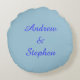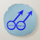 This awesome round pillow is designed for gay men. It features two blue male symbols standing side by side. The background is blue and there is customisable blue text inside each of the symbols to put names.