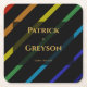 Clean, elegant, and built to last — this square coaster features the grooms' names and wedding date in gold typography against the signature diagonal rainbow stripes on black. A stylish bar accessory for the cocktail hour, reception, or any celebration long after the wedding day.