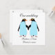 A wedding invitation. Two penguins, both a black, the white parts of the penguin have been replaced with pastel blue (indicating that they may be male). I also have this card with pink pastel coloured penguins. I based these birds on Hoiho, The yellow Eyed Penguin.This invitation can be fully customised to suit your needs.