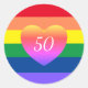 Gay Pride rainbow birthday sticker, with a colourful 50 and Fabulous and colourful heart design. With white and black script typography lettering, you can customise with your own text. A fun addition for that special 50th Birthday celebration.