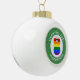 Brown haired angel wears the Gay Pride Rainbow Flag to support LGBTQ on this ceramic ball ornament for Christmas decor. The Christmas Gay Pride angel is found in the centre of a circle of white squiggly squares. The background is green squiggly squares. Add your own text or personalise with a name and customise with the year.