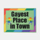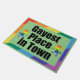 GAYEST PLACE IN TOWN DOOR MAT. KEEP THE IGNORANT SOLICITORS AWAY. JEHOVAH WITNESS WILL NOT KNOCK ON YOUR DOOR. LGBTQ HUMOR. GAY BUSINESS. NO BIGOTS ALLOWED. RAINBOW UNICORNS