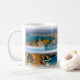 I like to buy and review my own work to ensure you get an outstanding product and I’m happy to give the Primary Colours Beach Football Mug 5 stars because it meets my expectations completely. Pleased with it I am. Zazzle mugs are well fabricated, microwave and dishwasher safe. And this yellow red and blue panoramic wraparound motif is sealed with a durable and sparkling Orca polished gloss glaze finish. It’ll never rub off! The size and energy of two jostling figures and a burly goal keeper fit the mug's circular shape well. There's momentum in the carousel effect as the two jostling figures repeat and move right around the mug and meet a burly goal keeper. Big sharp original images precisely drawn and delicately captured in blue and red with plenty of bright yellow! An ideal gift for anyone who plays ball! A fun gift for all beachball and football fans. A pair with the Retro Grey-Grain Beachball Player Mug. Available in two sizes and several styles including Black Ringer, Travelling, and Stern. Go have a peek!