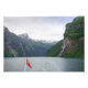 Photo print of the majestic Geirangerfjord, a fjord towards Geiranger and Hellesylt with Seven Sisters waterfall and a Norwegian flag seen from a ferry boat in Norway.