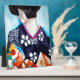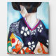 with original art design from watercolour painting of Japanese Geisha in dark blue intricate detailed orange kimono with sky blue background. Bright and colourful, inspired by oriental and Asian art, this beautiful lady comes from the Kyoto region of Japan.