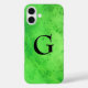 Phone case in a gem stone slab pattern, with a black onyx look monogram - rich lime green jade (jadeite), mottled with deeper emerald green