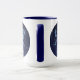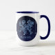 Mug featuring the zodiac symbol for Gemini in soft silver blue, as a round medallion, overlaid with the stars of the constellation, against a starry sky background graded from deep midnight blue to black.