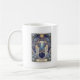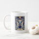 "Celebrate the duality and intellectual charm of the Gemini zodiac with this ethereal coffee mug. Featuring twin celestial figures facing each other in a starry night sky, this design is adorned with the caduceus symbol and a beautiful border of morning glory flowers. Perfectly capturing the communicative and versatile energy of the twins, this vintage-style illustration is an ideal gift for those born between May 21 and June 21, or for anyone who loves mystical art and the magic of the air element."
