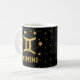 Custom mug for "Gemini" with golden zodiac symbol, gold stars, and earthy black background.