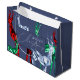 A unique & stylish country blue Christmas gift bag designed with hand-painted watercolor crystal reindeer in three gemstone varieties: emerald, ruby and blue topaz