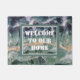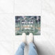 This welcome mat for your front door features a photo that captures the beautiful colours in a polished piece of fluorite. This gemstone displays colours of purple, green, and yellow in a striped pattern displaying the unique cubic crystals of this gem. "Welcome To Our Home" appears inside a rectangular frame in the centre of this door mat.