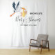 A flying stork holding a baby. A clean white elegant background for a baby shower photo backdrop. Template for the mum to be's name and the date. Black letters. The text: Baby Shower is written with a modern and trendy hand lettered style script. Gender neutral, baby boy or baby girl.