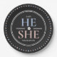 Personalised gender reveal He or She paper plate with dark background and pink & blue sign. Visit the shop to see all the collection!