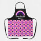 Medium-sized apron with an image of a genderfluidity pride flag and a rainbow, and repeating seamless flower pattern; pink, white, black, and purple design on a black background, with a customisable text template for your own name or message