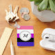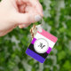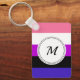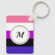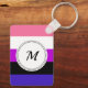Keychain with the genderfluidity pride flag with rainbow stripes of purple, black, magenta, white, and pink, genderfluidity pride design with a custom text field for your initial