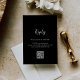 Modern QR Code wedding RSVP Card featuring a minimal design with white text over a black background in a combination of simple sans serif fonts and an elegant script. You may remove the QR code in the design editing tool. The back has your favourite photo. This chic response card would be great for a goth themed or Halloween wedding.