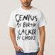 Genius by Birth, Slacker by Choice Light Tee Shirt: For the smart but lazy. Funny parody spoof satire joke jokes comedy brilliant brain brains brainy deadbeat stupid dumb idiot wasted irony ironic quirky goofy silly hilarious ridiculous weird odd strange offbeat odd awesome pop culture humour.