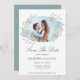Our gentle botanical collection features light green, teal and gold gentle watercolor foliage paired with golden frames and teal background for a perfectly elegant wedding collection. You can find matching items for your complete wedding experience but also crafts, gifts and some personal items. We believe that you are going to enjoy it to the fullest as it is a collection for every season. This save the date card features your own photo in a blue foliage wreath with all information in elegant script for you to customise