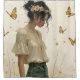 A young woman with dark, wavy hair stands in a dreamy, pastel-coloured background. Her romantic outfit, featuring a cream-coloured blouse and a floral headpiece, gives her a natural and delicate aura. Golden butterflies flutter around her, enhancing the atmosphere of lightness and harmony. The soft tones and intricate details create a poetic and serene mood.