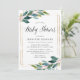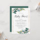 Stylish and elegant baby shower invitation featuring watercolor leaves and branches in vibrant shades of dark green and teal. A stunning faux gold foil frame surrounds your baby shower details for a look that is perfect for spring and summer baby showers.