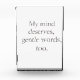 A simple, minimalist design carrying a powerful message of self-compassion. The quote, "My mind deserves, gentle words, too." is rendered in an elegant, soothing serif font and a soft, muted grey color against a light neutral background. This graphic serves as a gentle reminder to practice self-kindness, challenge negative self-talk, and prioritize mental well-being. It is perfect for those who advocate for self-care, mindfulness, positive affirmations, and emotional health. An ideal design for a calming poster, apparel, or daily motivational item.