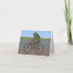 A dark green frog wearing a tan plaid ivy cap (or driving cap) and a satisfied smile pedals along on a red bicycle on a dirt road by a moss-covered grey stone wall in the mixed media image on this note card. With deep blue skies above, it looks like he has a beautiful day for cycling! From my original digitally created image.