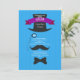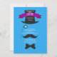 A dapper man's invitation with top hat, monocle, moustache and bow tie against a blue striped background.
