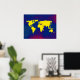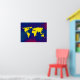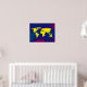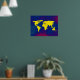 A graphic yellow world map over a bluish background. A cool geography-themed digital illustration for your wall