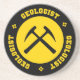 Geologist - yellow and black sandstone coaster with collegiate style lettering and crossed rock hammers graphic.