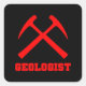 Geologist - black sticker with red collegiate style lettering and crossed rock hammers graphic.