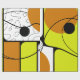 This design presents a dynamic arrangement of geometric elements, including large warm orange semi circles, lime green blocks, solid black circles, and white areas filled with dotted patterns and freeform line drawings. Thick black outlines frame the shapes, while sweeping curved lines connect different sections of the composition. The combination of lime green, orange, black, and white creates a vivid, modern, and visually striking abstract artwork.