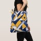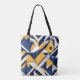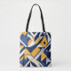 Geometric abstract pattern with overlapping navy blue, yellow, and white triangular shapes tote bag