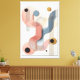 The image presents a striking piece of abstract art that features a variety of geometric shapes and lines. Dominating the composition is a large, central orange circle, surrounded by an array of black, white, and colored elements. These include smaller circles in hues of red, blue, green, and yellow; straight and curved black lines; rectangles; and half-circles. The background is primarily white with sections of light gray vertical stripes. The artwork has a modernist feel with its clean lines and bold use of color contrasted against the neutral background.
