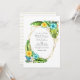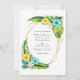 Exotic turquoise and yellow summertime beach floral wedding invitation featuring abundant tropical greenery in a golden geometric frame customisable to your event specifics. Ideal for any given theme or garden wedding. The QR code on the reverse directs to your wedding site where people can learn more and rsvp.