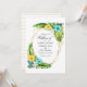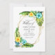Exotic turquoise and yellow summertime beach floral wedding invitation featuring abundant tropical greenery in a golden geometric frame customisable to your event specifics. The photo on the reverse is optional. If you would rather remove it, scroll down to the bottom of "Personalise this template" and click on "Edit Using Design Tool". In the Design Tool you can edit, scale, delete or move any text or design elements you wish.
