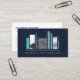 Stylish business card for an architect, in grey, blue, and turquoise with geometric shapes filled with photos, colours, and patterns.